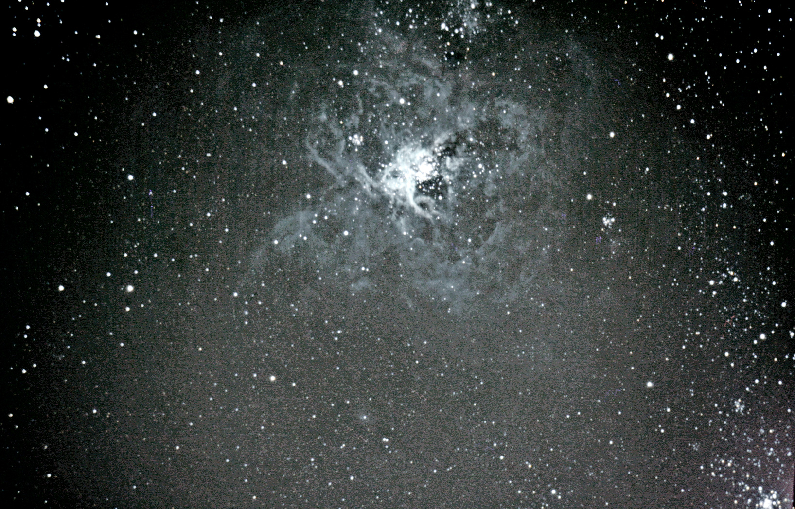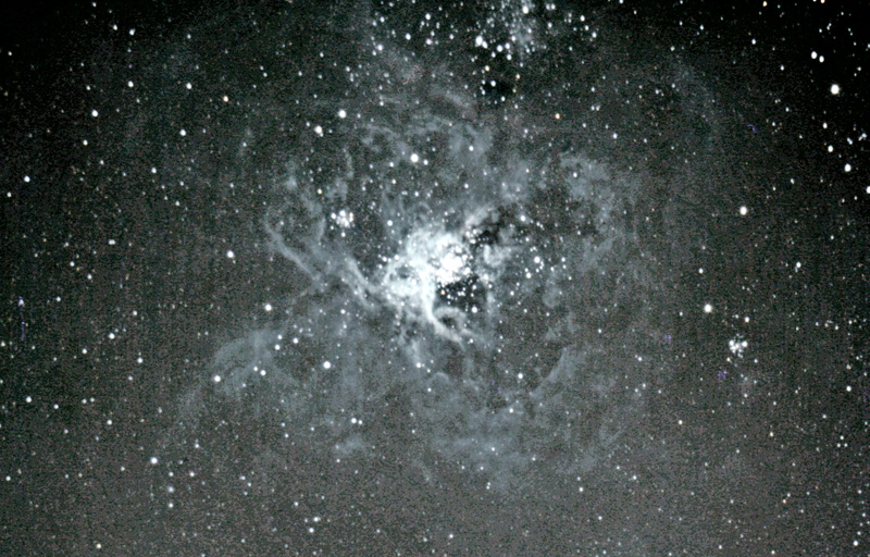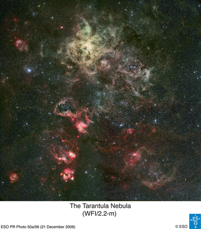 NGC2070 - Tarantula NebulaThe Tarantula Nebula (also known as 30 Doradus, or NGC 2070) is an H II region in the Large Magellanic Cloud. The Tarantula Nebula has an apparent magnitude of 8. Considering its distance of about 160,000 light years, this is an extremely luminous object. Its luminosity is so bright that if it were as close to Earth as the Orion Nebula, the Tarantula Nebula would cast shadows. | |